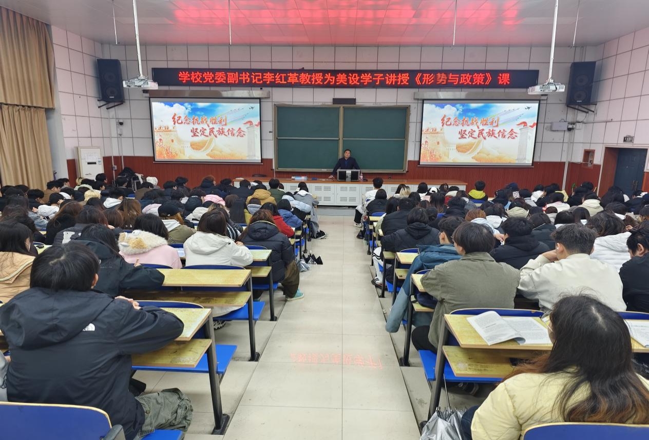 为深入学习贯彻习近平新时代中国特色社会主义思想,弘扬伟大抗战精神,引导学生树立正确的历史观、民族观、国家观,11月17日晚,湖南文理学院党委副书记李红革教授在第三教学楼D201教室,为美术与设计学院2024级全体学生讲授了题为“纪念抗战胜利,坚定民族信念”的形势与政策课。美术与设计学院党总支副书记彭婷、学工办主任赵昕一同听课,与学生们共同重温抗战历史,感悟民族精神。