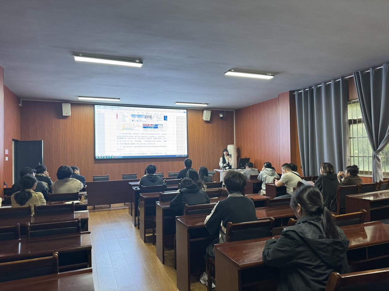 会议第一阶段,由学院党总支副书记彭婷为2026届学生为同学们作考研报名专题指导。她结合往年报名经验,详细讲解报名流程与关键注意事项,提醒同学们务必通过官方网站操作,仔细核对姓名、身份证号等关键个人信息,并合理选择考点,提醒学生要密切关注目标院校的招生简章,结合自身实际情况、专业兴趣与长远发展规划,科学审慎地做出选择,避免盲目跟风,确保报名环节准确无误。